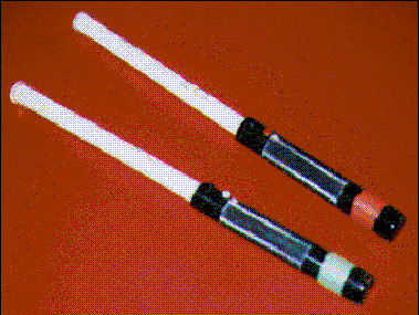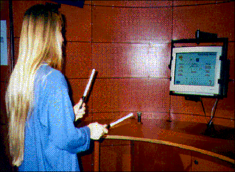 The WorldBeat exhibit runs on an Apple Power Macintosh 8500/120 computer. A MIDI Interface connects it to a Buchla Lightning II spatial MIDI controller [13] that consists of two wireless, infrared batons (see Fig. 1), a tracker unit that we attached to the computer monitor, and the base unit that contains the controller interface and MIDI sound module. The batons are battery-operated and each feature an additional action button.The exhibit further consists of a microphone connected to a Roland pitch-to-MIDI converter (for Query By Humming), and standard audio equipment (amplifier, tape deck, speakers, and headphones).