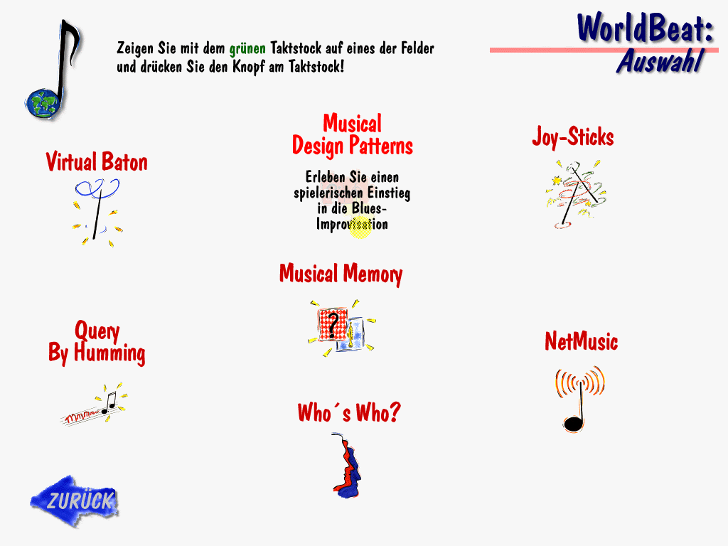 For the visual design of the WorldBeat pages, we worked together with a graphic design student. Using our ideas as input, she created logos to represent WorldBeat and its modules. A major issue was to create a non-technical look; we achieved this by scanning and rescaling her hand-painted logos, instead of having her draw them using graphics software. The designer created similar logos for the remaining KnowledgeNet exhibits and for common user interface elements (buttons, arrows, etc.) which helped to create a homogeneous appearance for the complete floor.